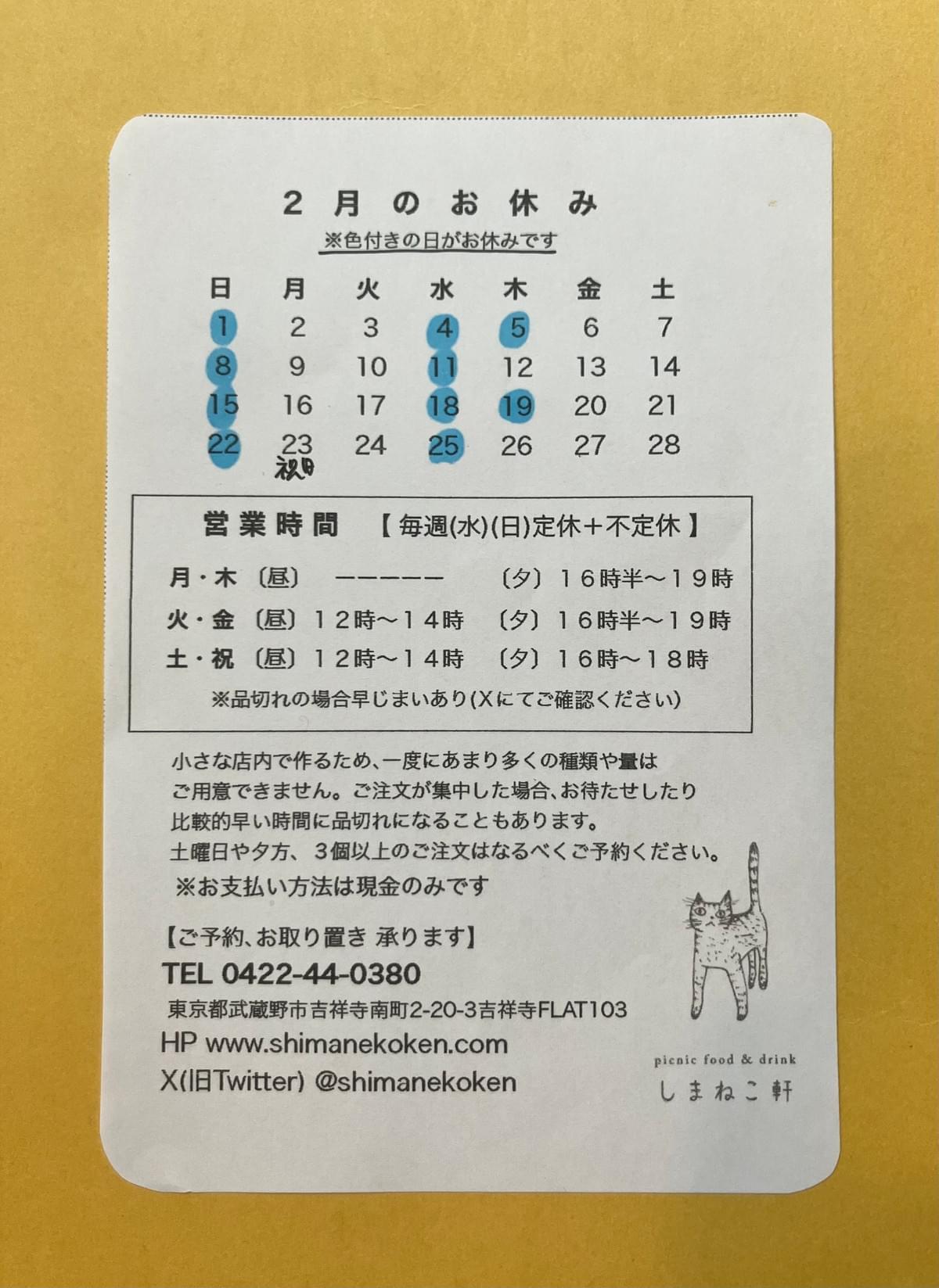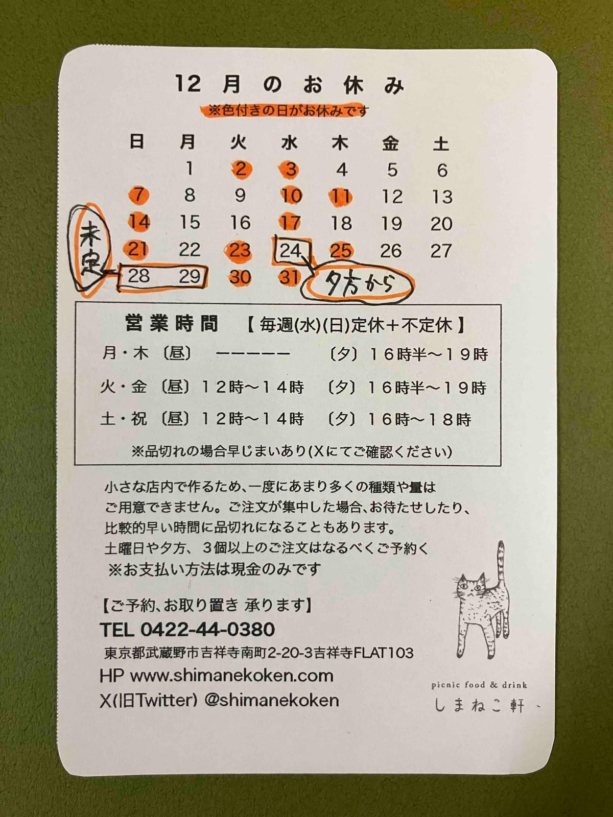 しまねこ軒では できる限り国産の材料を使い、季節の野菜がたっぷりの日常的なお惣菜や、お好きなおかずを選べるお弁当、素朴で気軽なお菓子などを その日の天気や食材に合わせて作っています。
