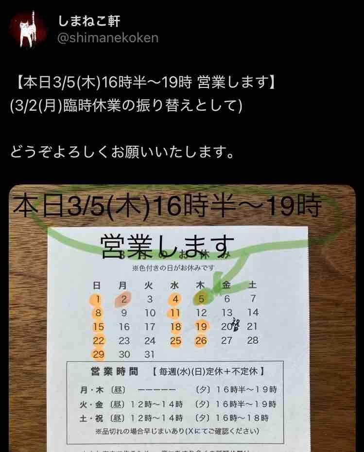 X(旧Twitter) @shimanekoken にてお知らせしています